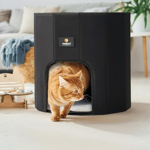Veehoo Cat House Cat Beds for Indoor Cats – Large Cat Hideaway Bed with Removable Cushion & Scratching Pad, Modern Foldable Cat Condo Enclosed Cat Bed Caves for Multi Small Pet Kitty Kitten, Black