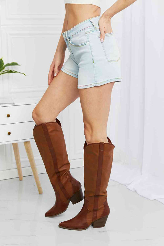 Pantalones cortos de mezclilla con costuras en contraste y bolsillos de tamaño completo en azul Judy