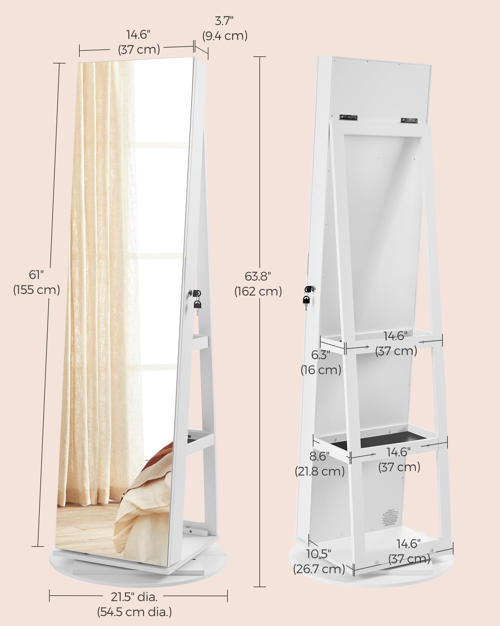 Lock Your Valuables Up: If you want to keep your valuables safe and out of reach, this mirror jewelry cabinet ticks your boxes. 2 keys allow you to lock your cherished bling away, so no little hands get in.